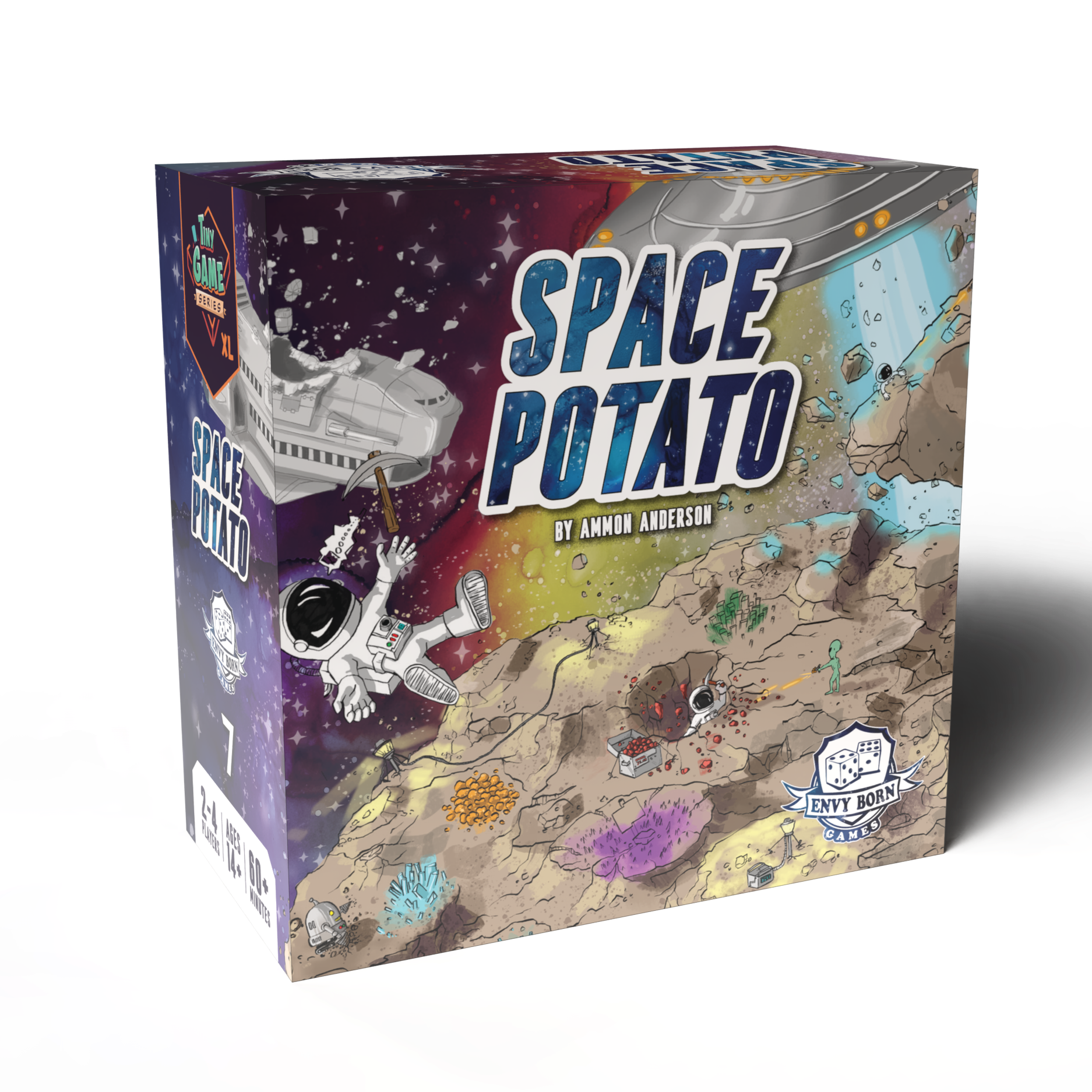 Space Potato is a HUGE game in a tiny box. Your multi-corporation vessel has been struck by a massive, potato-shaped asteroid. This is an expensive inconvenience for our shareholders. You have been tasked with repairing the ship using materials mined directly from the "Potato." Try not to die, but if you do, please ensure your paperwork is filed first.You and your "rival" managers must fix the ship before the asteroid disintegrates. If the asteroid is mined into dust before the ship is functional, everyone loses (and the company gets a massive tax write-off). But if you save the ship, the manager with the most Profit Points wins..